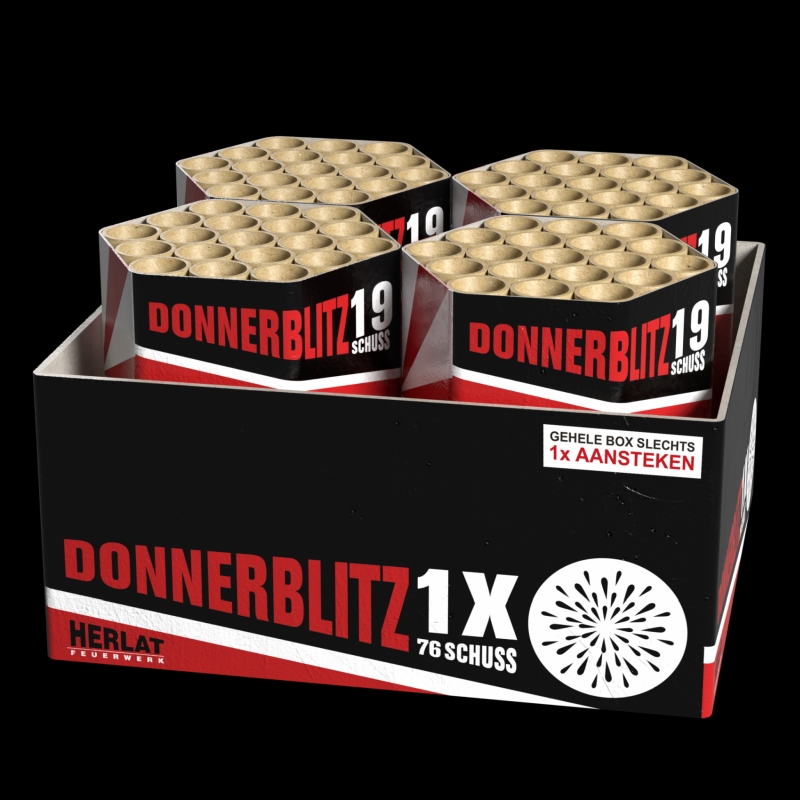 Die Herlat-Serie von Zena ist bekannt für gute Qualität zum günstigen Preis, so auch das Verbundfeuerwer Donnerblitz. Insgesamt 76 Schuss im Kaliber 30 mm zeigen was heutzutage im Silvesterfeuerwerk möglich ist. Verschiedene Gold-Brokat-Effekte mit bunten Spitzen, blaue Päonien-Sterne mit goldenen Blinksternen, sowie Kinsterpalmen und Cracklingwolken.