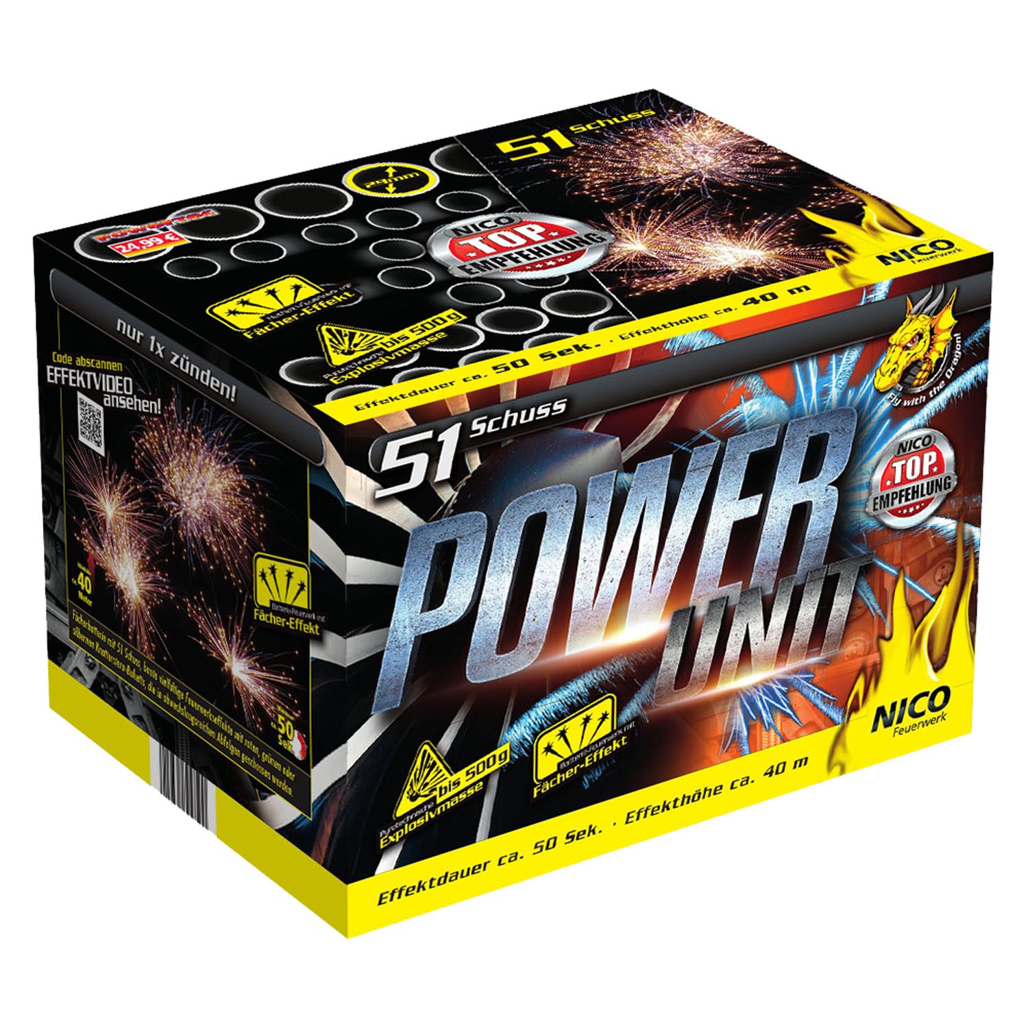 50 Schuss, nacheinander zündend, starke Effektbatterie mit großen Silberpalmen, grünen oder goldenen Blinkstern-Buketts, bunten Chrysanthemen oder lang ziehenden Crackling-Lanzen.